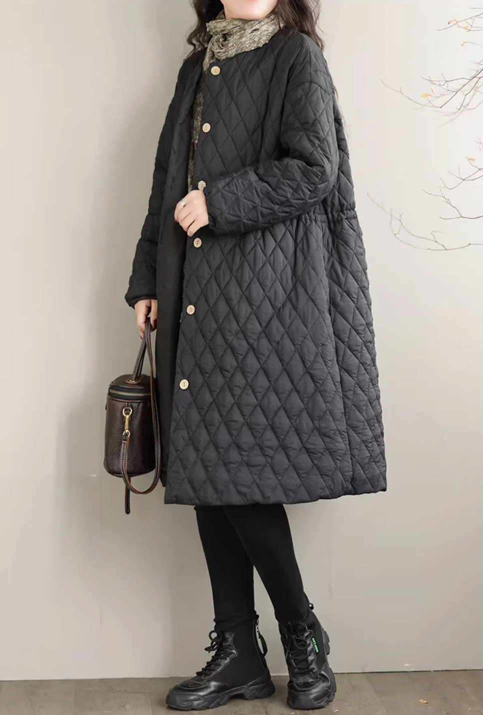 - Item: Fashion Winter Cotton Warm Round Neck Plaid Cotton-In Long Coat